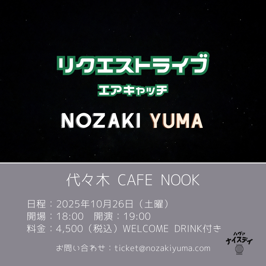 10/26(日)代々木 cafe nook 【リクエストライブ 〜エアキャッチ〜】 開場:18:00 開演:19:00 料金:¥4,500(消費税込み) 全席自由・入場はチケット購入時の整理番号順 出演:野崎有真 Gt,